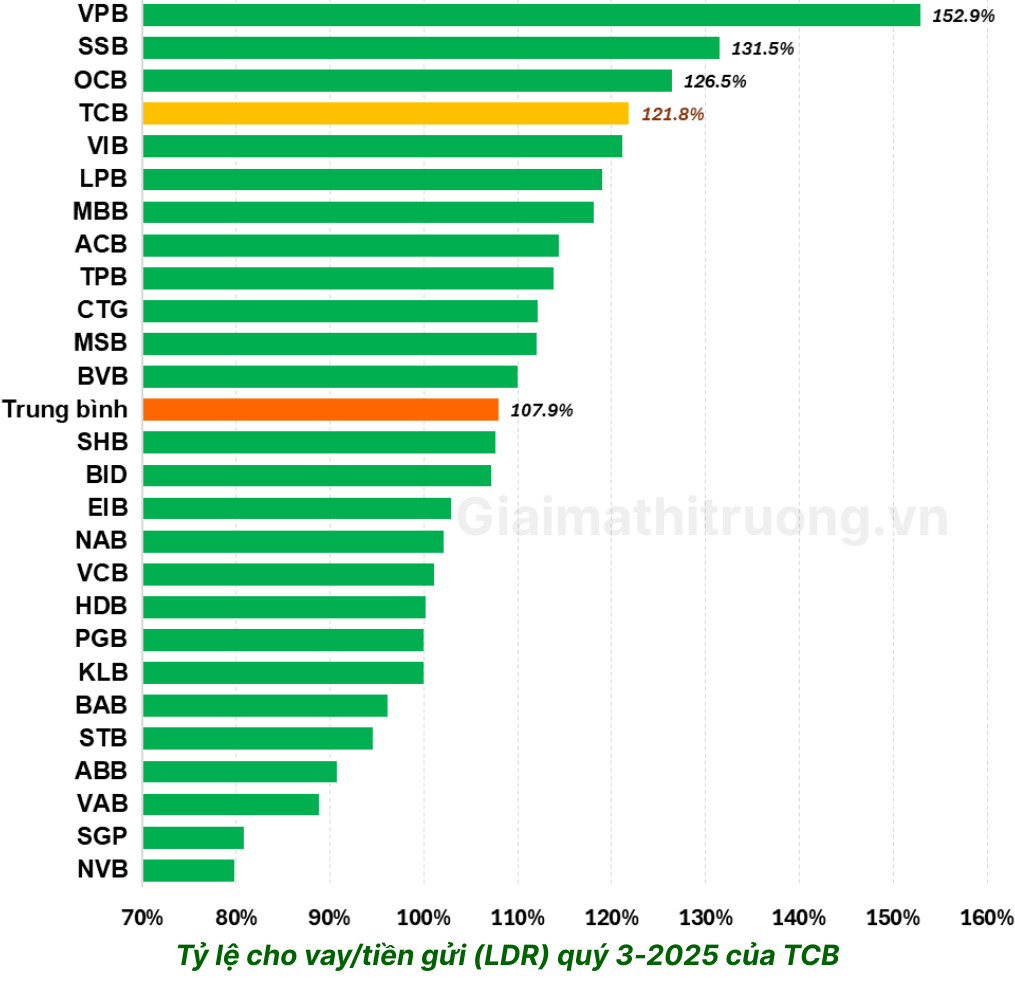 • LDR (cho vay/tiền gửi) lên tới 121,8% – cao nhất trong nhiều năm, đứng thứ 4 ngành