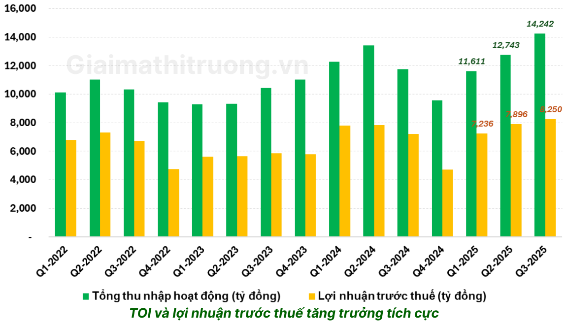 • Tổng thu nhập hoạt động (TOI) quý 3/2025 tăng 21,2% so với cùng kỳ, nhờ cả tín dụng, phí dịch vụ và kinh doanh ngoại hối.