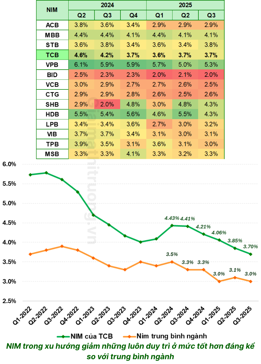 • NIM đạt khoảng 3,7%: đã giảm so với đỉnh 2020–2022 nhưng vẫn cao hơn đáng kể so với trung bình ngành (khoảng 3%)