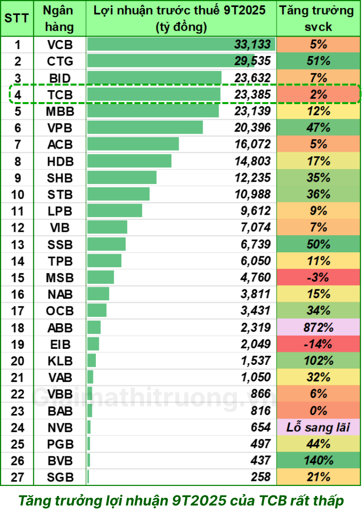 Dù LNTT 9 tháng đứng thứ 4 trong 27 ngân hàng niêm yết, tăng trưởng lợi nhuận của TCB chỉ khoảng 2% YoY – thuộc nhóm thấp nhất ngành, chủ yếu do NIM bị co lại. So với một ngân hàng vốn được gắn với hình ảnh “tăng trưởng vượt trội”, con số này buộc nhà đầu tư phải điều chỉnh kỳ vọng.