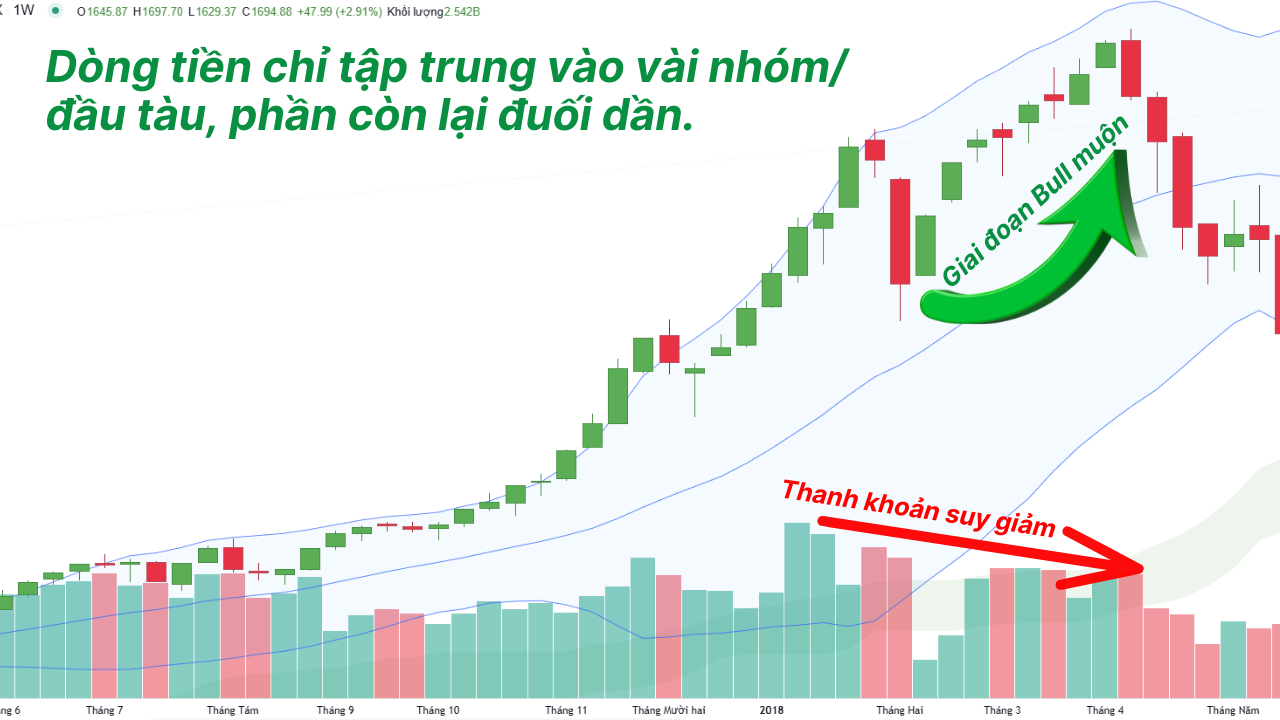 • Thanh khoản cạn dần: giao dịch ít, dòng tiền yếu.