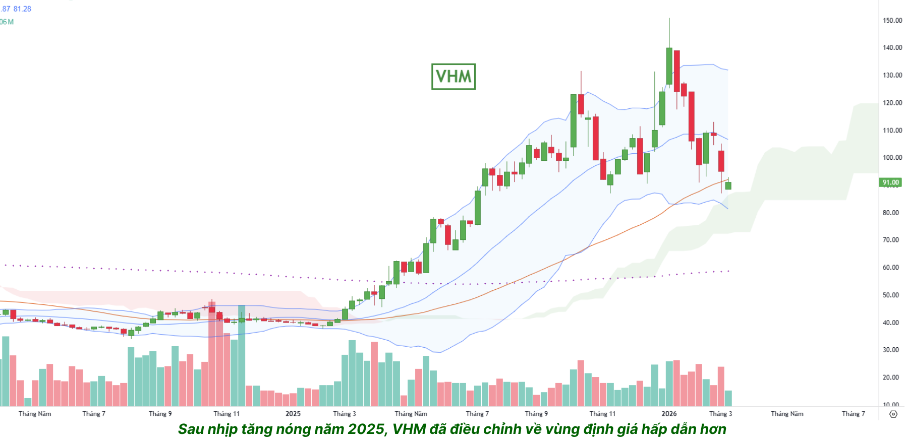 VHM đạt mức giá cao nhất mọi thời đại vào ngày 8/1/2026 ở mức 150.900 đồng, và hiện đang giao dịch quanh vùng 88.000 đồng – đã điều chỉnh hơn 45% từ đỉnh lịch sử.