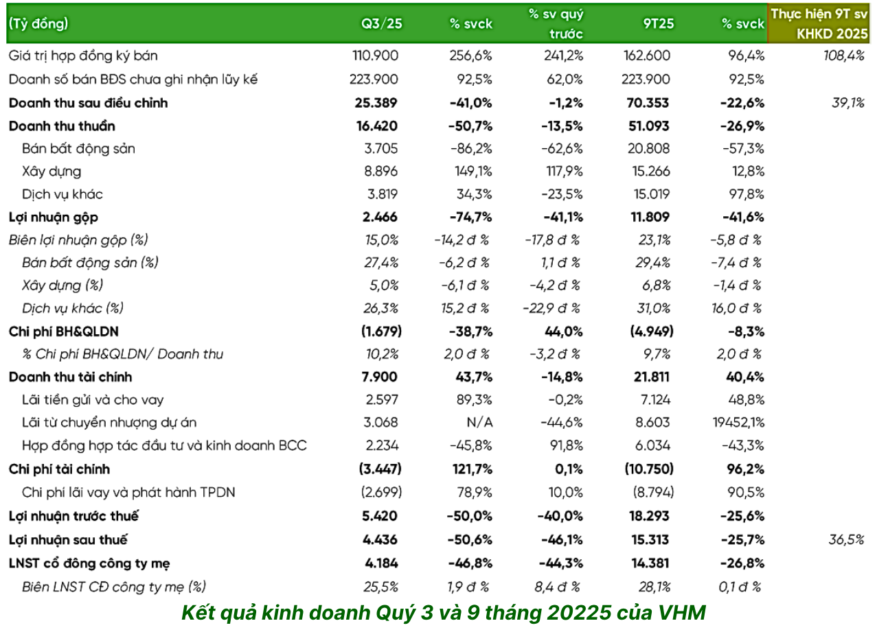 VHM sở hữu danh mục gồm nhiều dự án lớn sẽ thúc đẩy doanh số giai đoạn 2025-2027. Cụ thể, doanh số ký kết 9 tháng đầu 2025 gần gấp đôi svck, đạt hơn 162 nghìn tỷ VND, và doanh số chưa ghi nhận kỷ lục 224 nghìn tỷ VND (chủ yếu từ Green Paradise). Đây là nguồn doanh thu tương lai sẽ được hạch toán theo tiến độ xây dựng/bàn giao.