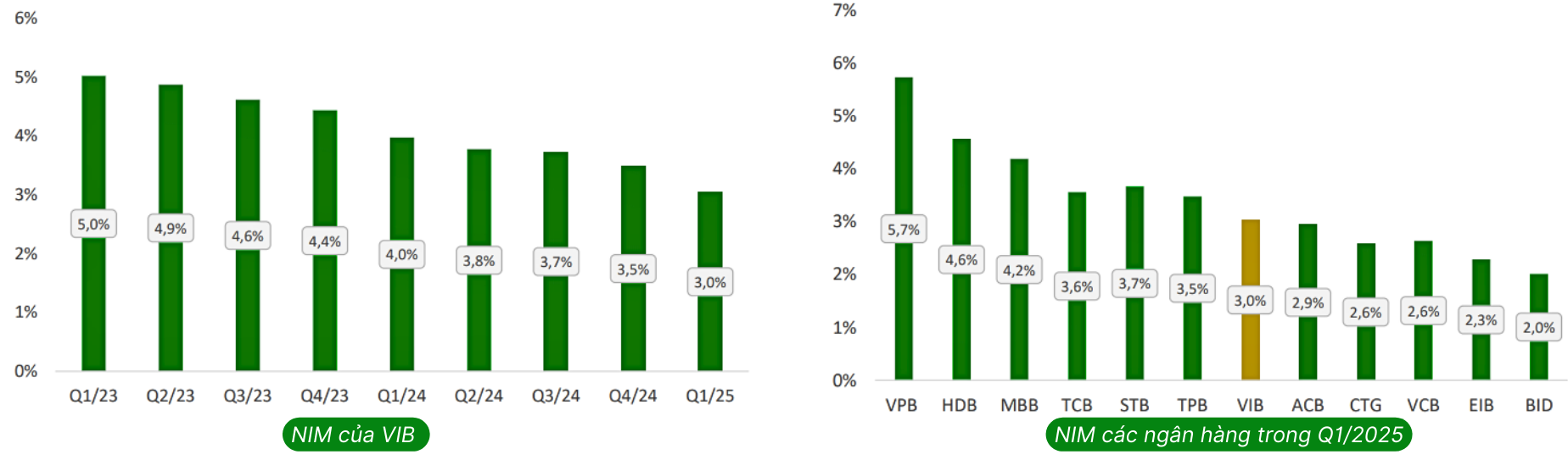 ➢ Trong giai đoạn trước năm 2023, việc VIB tập trung mạnh vào một số phân khúc thị trường “ngách” đã giúp ngân hàng đạt được tốc độ tăng trưởng cao, nhưng cũng đi kèm với một số nhược điểm đang lưu ý là chất lượng tài sản suy giảm dần. Trong giai đoạn đầu của quá trình tín dụng mở rộng nhanh, với động lực chính từ mảng cho vay ô tô và tái cấp vốn mua nhà giúp VIB duy trì được mức biên lãi ròng (NIM) vượt trội so với các ngân hàng cùng phân khúc. Điều này khiến VIB trở thành một trong 3 cổ phiếu ngân hàng tăng mạnh nhất giai đoạn 2020-2021. Tuy nhiên, khoảng cách về NIM bắt đầu thu hẹp từ cuối 2023 và NIM của VIB liên tục giảm khi các yếu tố bất lợi vĩ mô gia tăng. Sau giai đoạn khủng hoảng thị trường bất động sản và trái phiếu doanh nghiệp 2022–2023, vốn đã lan rộng sang khách hàng cá nhân và tác động mạnh đến chất lượng tài sản của VIB.