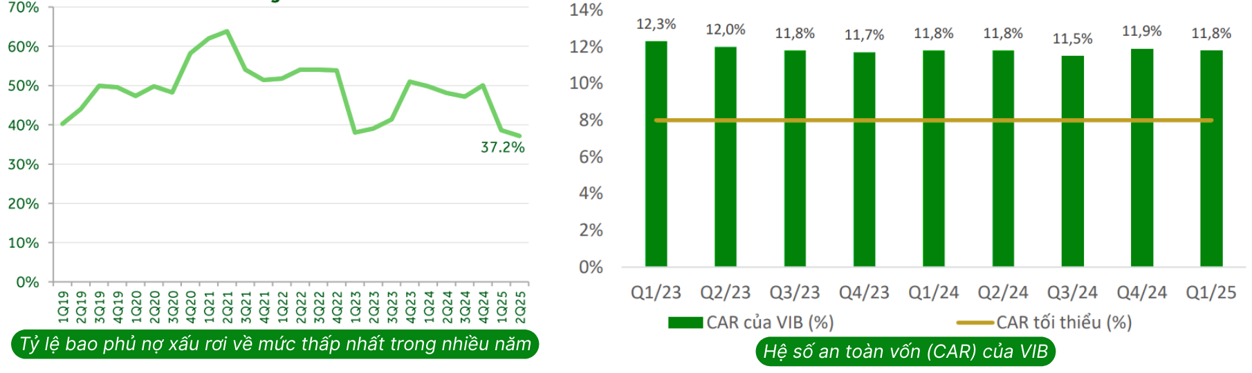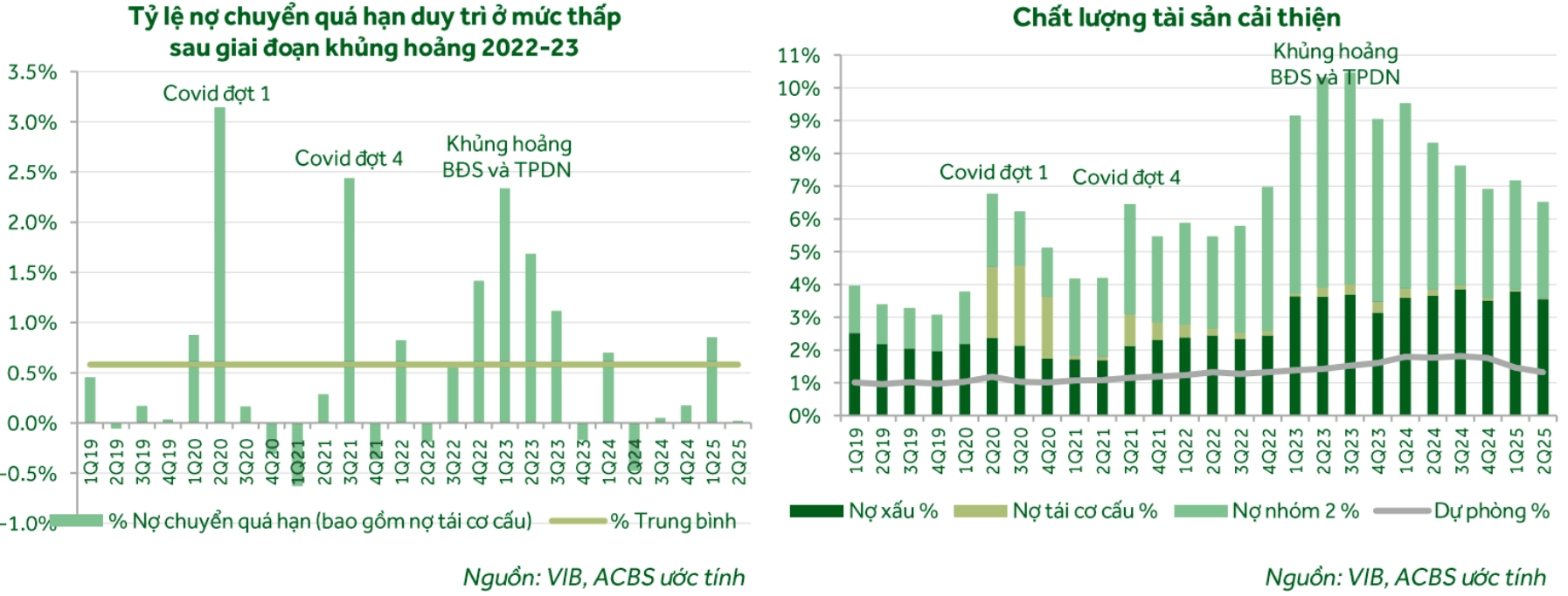 ➢ Trước đây, tỷ lệ nợ quá hạn (bao gồm nợ xấu, nợ nhóm 2 và nợ tái cơ cấu) của VIB có thời điểm vượt 10%, nhưng đến cuối Q2/25 đã giảm xuống còn dưới 6,5%.
