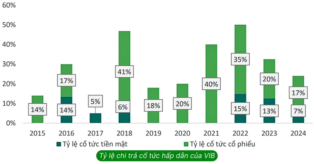 VIB là một trong những ngân hàng hiếm hoi chia cổ tức đều đặn hàng năm với tỷ suất cổ tức rất cao bằng cả tiền mặt lẫn cổ phiếu.